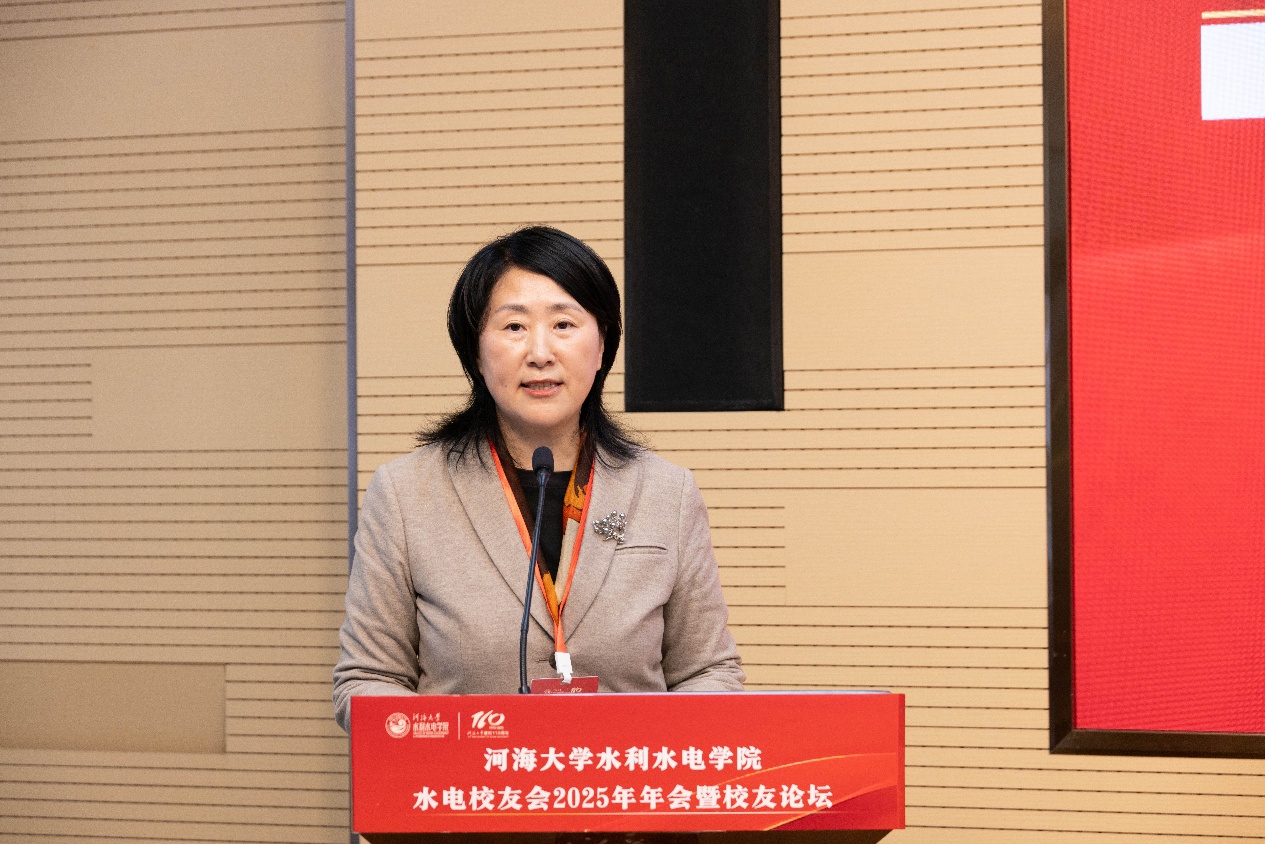 王媛院长首先代表学院向长期以来始终心系母校、支持学校学院建设与发展的各位校友致以最衷心的感谢和最崇高的敬意!她表示,学院始终以"治水兴邦"为己任,紧密围绕国家重大战略需求及世界科技发展前沿,制定学科发展的战略规划,在科技创新、人才培养、国际交流等领域取得了一定的成绩,以争创一流的毅力和意志,不断深化内涵式高质量发展。期盼校友们一是坚守初心,勇担使命,在水利事业发展中再立新功。二是常念母校,情系学院,在产学研合作中深化共赢。三是薪火相传,引领后学,为国家强国建设、民族复兴伟业贡献河海水电人的智慧和力量。